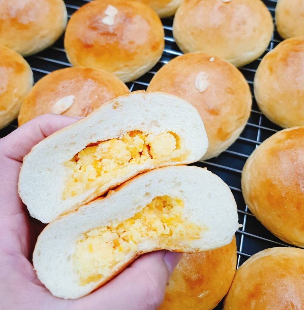 口感:餡料與麵糰的比例為1比2,鹹甜交織的台南味,深得台南人的喜好,曾經一天熱銷3000顆,餡料多多的鹹蛋奶酥麵包,絕對讓你吃得過癮。